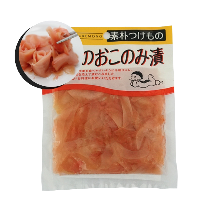 ขิงสไลซ์เส้นแดง (เบนิโชกะ) มักใช้โรยบนข้าวหน้าเนื้อ, ราเมน, โอโคโนมิยากิ, ทาโกะยากิ, ยากิโซบะ, หรือ โอยาโกะด้ง เพื่อล้างรสชาติที่ตกค้างในปากและเสริมรสชาติอาหารให้อร่อยยิ่งขึ้น เราใช้นวัตกรรมการผลิตที่พิถีพิถัน เน้นความสะอาด ตั้งแต่ขั้นตอนการคัดขิงอ่อนที่ดีที่สุด จนถึงการปรุงรส เพื่อให้ได้รสชาติที่กลมกล่อม หอม อร่อย ลงตัว
